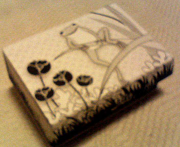 このあいだ書いていたカエルのイラストを、お菓子の空き箱を利用して作り直した箱に貼り付けてみました。