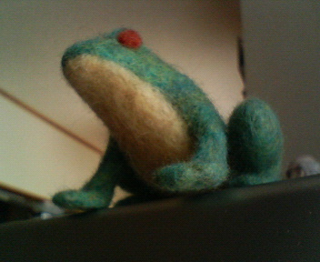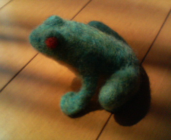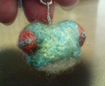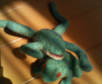 材料は羊毛なので、ふわっふわな出来上がりかと思いきや、形を整えようとあちこちいじり倒していたら、高密度におもいっきり毛を植えまくったので (ちょっとでも隙間を見つけると毛を埋めまくったというか。)、出来上がりはすごく硬い。羊毛とは思えないほどに。